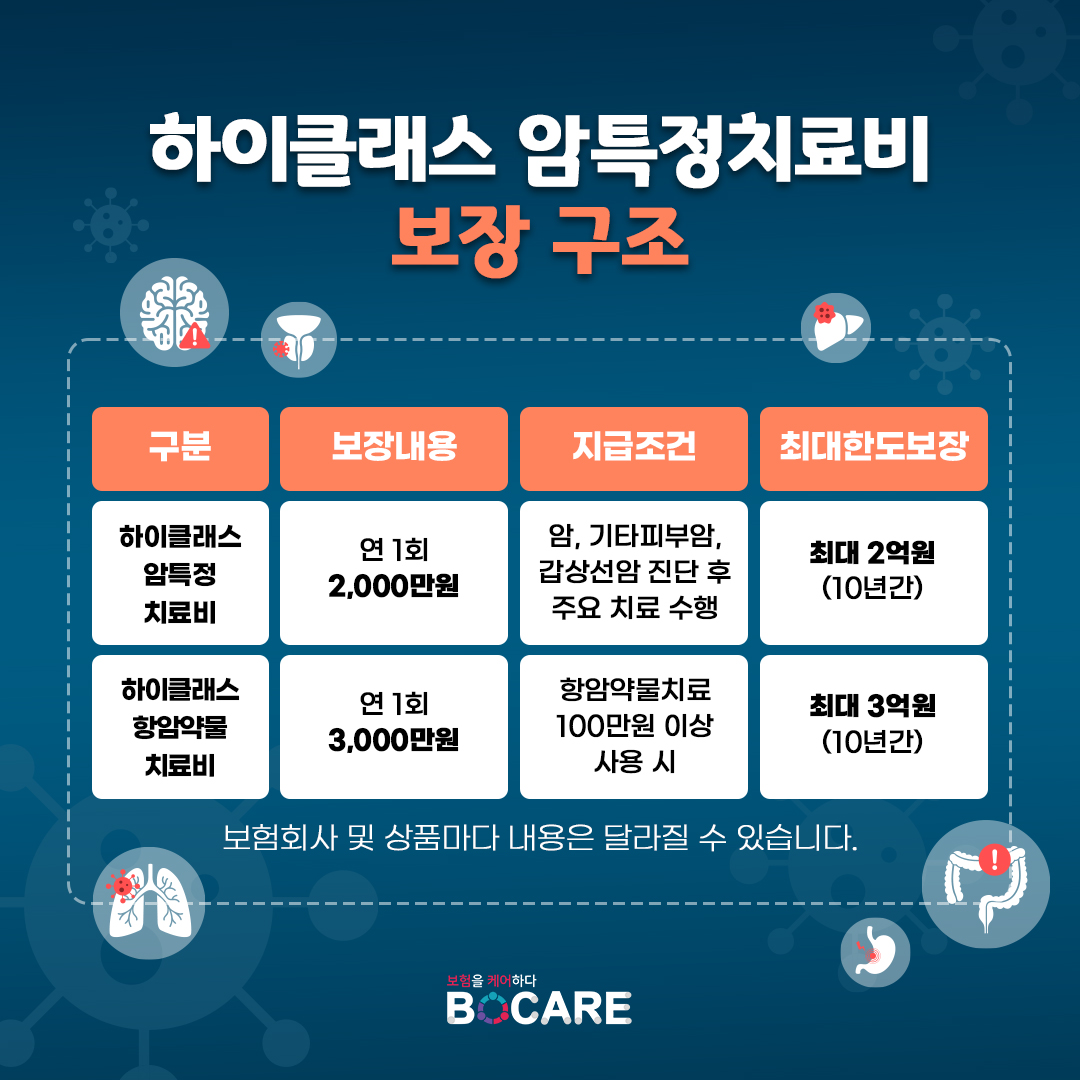 하이클래스 암특정 치료비 연 1회 2,000만원 지급, 최대 10년간 2억원까지 보장 하이클래스 항암약물 치료비 연 1회 3,000만원 지급, 최대 10년간 3억원까지 보장 -