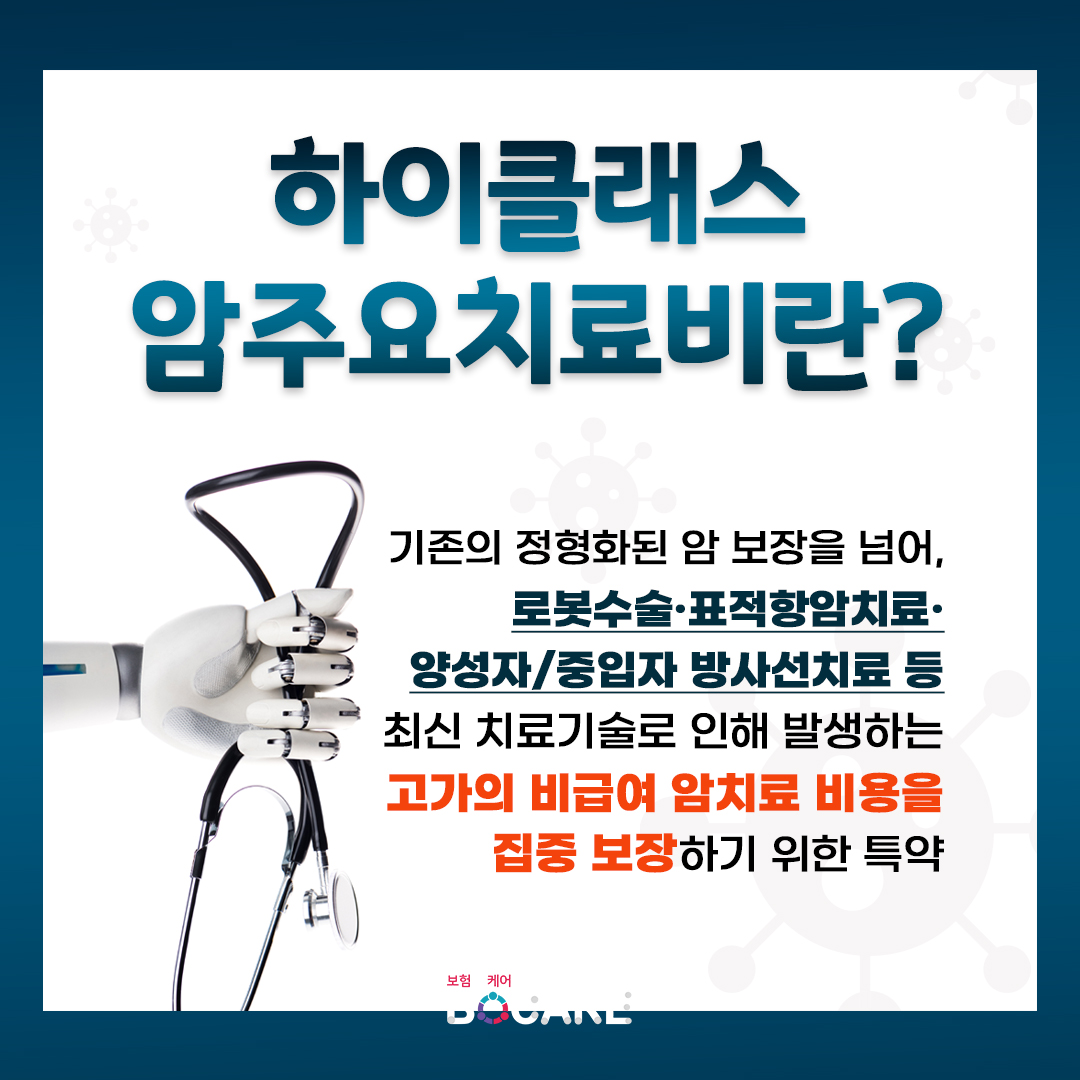 ‘하이클래스 암특정치료비’ 암 치료 로봇과 편안히 누워 있는 환자의 모습을 통해 고급 의료기술과 전문성을 강조하며, 비급여 암치료비 보장의 중요성이 부각되고 있습니다.
